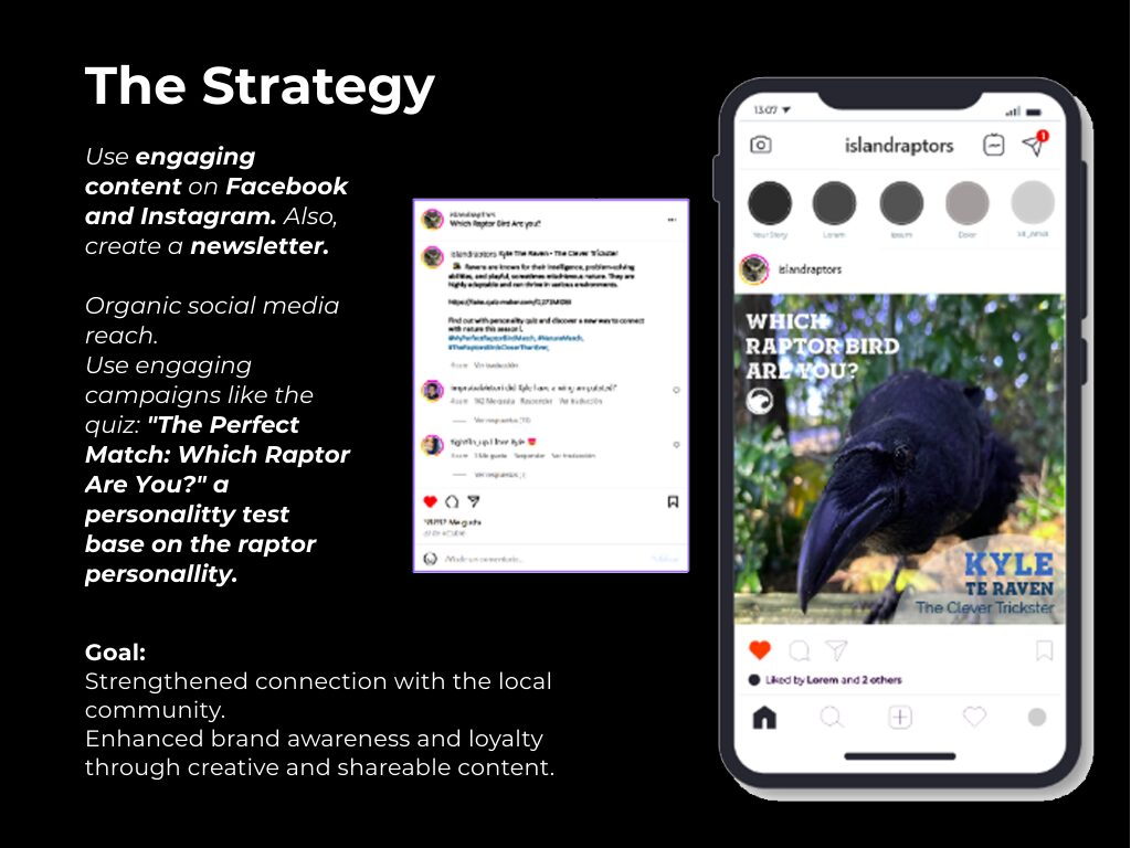 The Raptors, a wildlife education and conservation organization, aimed to enhance brand awareness, admissions, and email subscriptions through a cost-effective six-month digital marketing strategy targeting couples aged 25–45 in Victoria and Nanaimo. As the marketing strategist, I developed a multi-channel content plan for Instagram and Facebook, launched an interactive “Which Raptor Are You?” quiz to encourage virality, and initiated a new educational newsletter for lead nurturing. Additionally, I created engaging formats, such as polls and games, to maintain audience engagement. This strategy projected over 500 quiz engagements and 100 new admissions, significantly boosting organic reach and strengthening the brand’s relationship with the community.