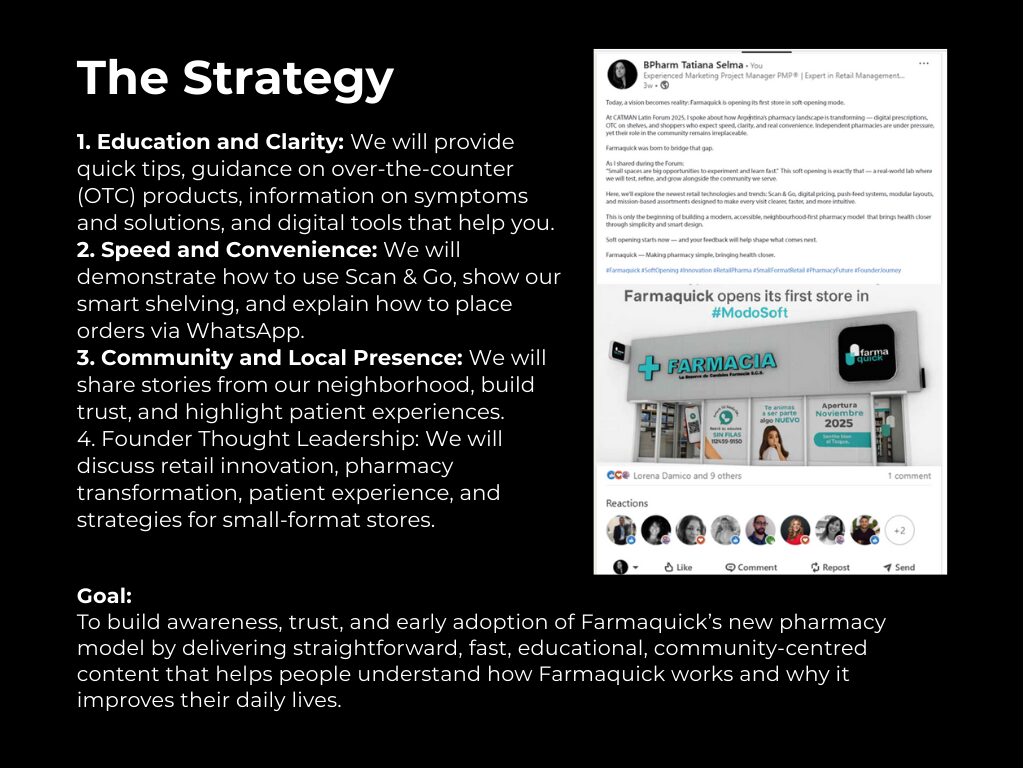 Farmaquick wants to build its online presence from scratch and teach consumers about its new small-format pharmacy model. To do this, we created a 12-month social media strategy. This strategy includes a summary, a plan for using various platforms, profiles of our target audiences, a competitor review, a content plan, and a posting calendar. We set clear goals: 1,500 Instagram followers, 1,000 Facebook followers, 1,000 TikTok followers, and 500 LinkedIn followers. We also defined key performance indicators (KPIs) for engagement and community interaction, establishing a strong base for future growth.